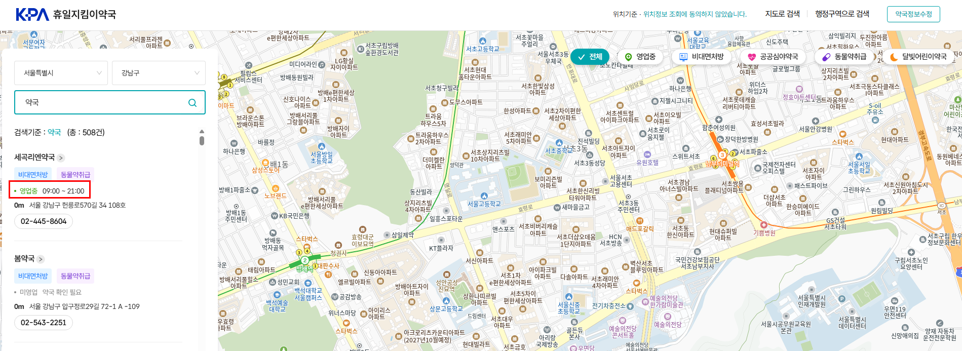 검색 결과에서 구분 항목을 확인하는 것이 중요합니다. '연중'으로 표시된 약국은 연중무휴 약국이고, '야간'은 밤 10시 이후 운영하는 약국, '연·야'는 연중무휴와 야간 운영을 모두 하는 약국입니다.