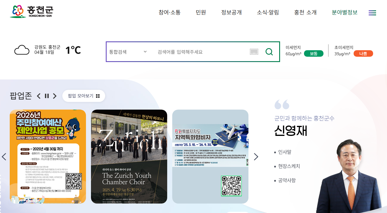홍천군청 홈페이지 : 청정 강원 홍천의 행정과 생활정보를 아우르는 온라인 창구