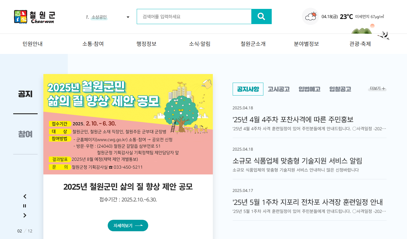 철원군청은 홈페이지를 통해 행정 정보를 신속하게 공개하여 군민들이 군정의 흐름을 정확하게 파악할 수 있도록 돕고 있습니다.