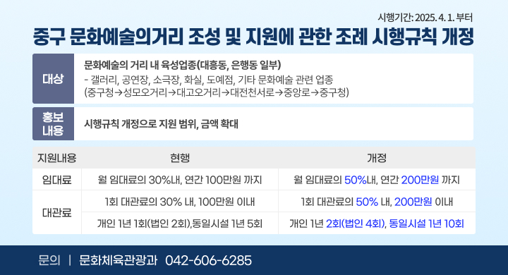 - 문화공간 및 회의실 대관: 평생학습관, 대흥동 문화공간, 구청 내 회의실 등의 대관 시스템 운영