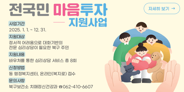 광주 북구청 홈페이지는 행정 민원부터 복지, 문화·교육, 구정 정보까지 통합 제공하는 디지털 플랫폼으로, 주민들이 쉽게 이용할 수 있도록 직관적이고 편리하게 구성되어 있습니다.