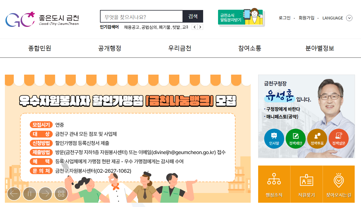 우리는 이 홈페이지를 통해 더 편리한 행정을 경험하고, 더 나은 금천구를 함께 만들어 갈 수 있습니다.