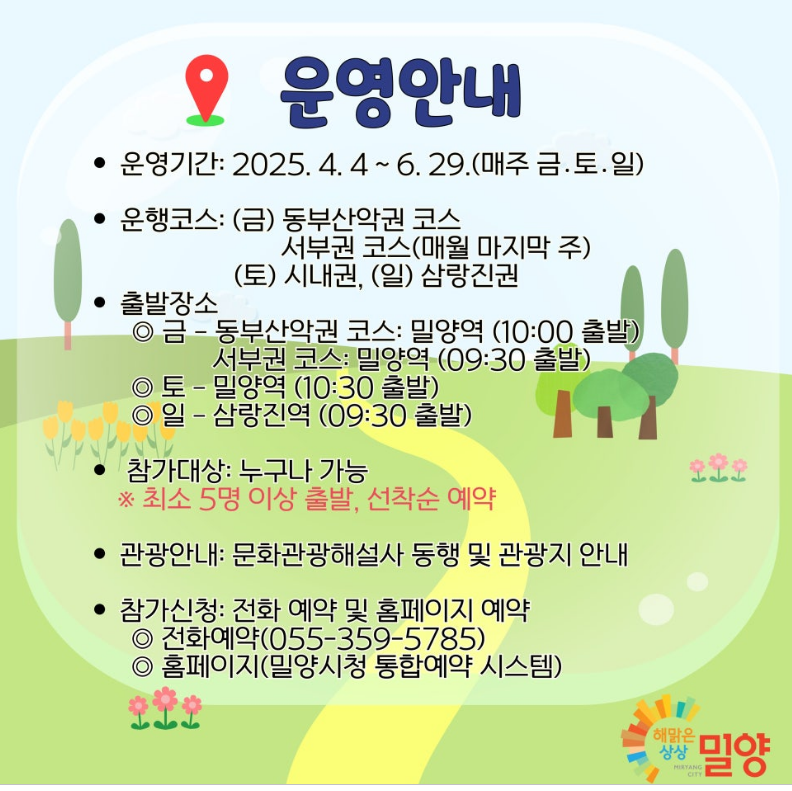 밀양 시티투어는 2025년 동안 매주 금요일부터 일요일까지 운행됩니다. 각 요일별로 다른 코스를 운영하여 밀양의 다양한 관광지를 효율적으로 둘러볼 수 있도록 구성되어 있습니다.