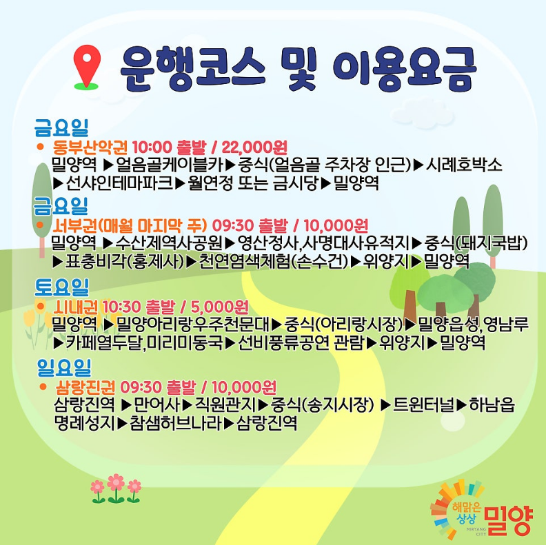 금요일에는 동부산악권 코스가 운행되며, 매월 마지막 주에는 서부권 코스가 운행됩니다. 동부산악권 코스에서는 밀양의 대표적인 자연 명소인 얼음골과 표충사 등을 방문할 수 있습니다.