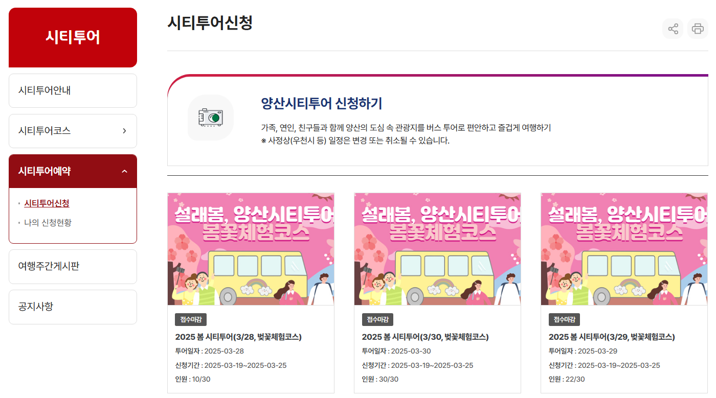 - 온라인 예약: 양산시 문화관광체육 홈페이지의 시티투어 페이지에서 신청
