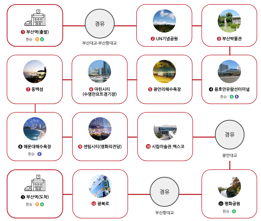 레드라인은 부산역을 출발하여 해운대 방향을 순환하는 노선으로, 부산의 대표적인 관광지를 연결합니다.