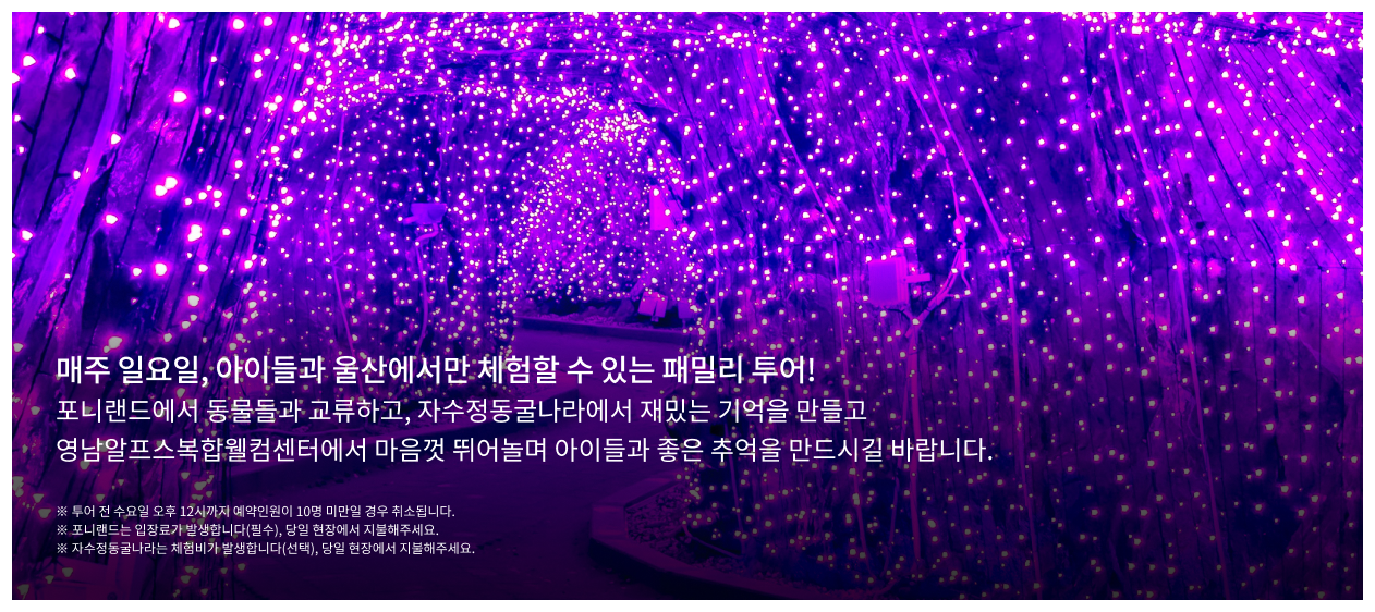 - 태화강역 → KTX울산역 → 포니랜드 → 중식 → 자수정동굴나라 → 영남알프스복합웰컴센터 → KTX울산역