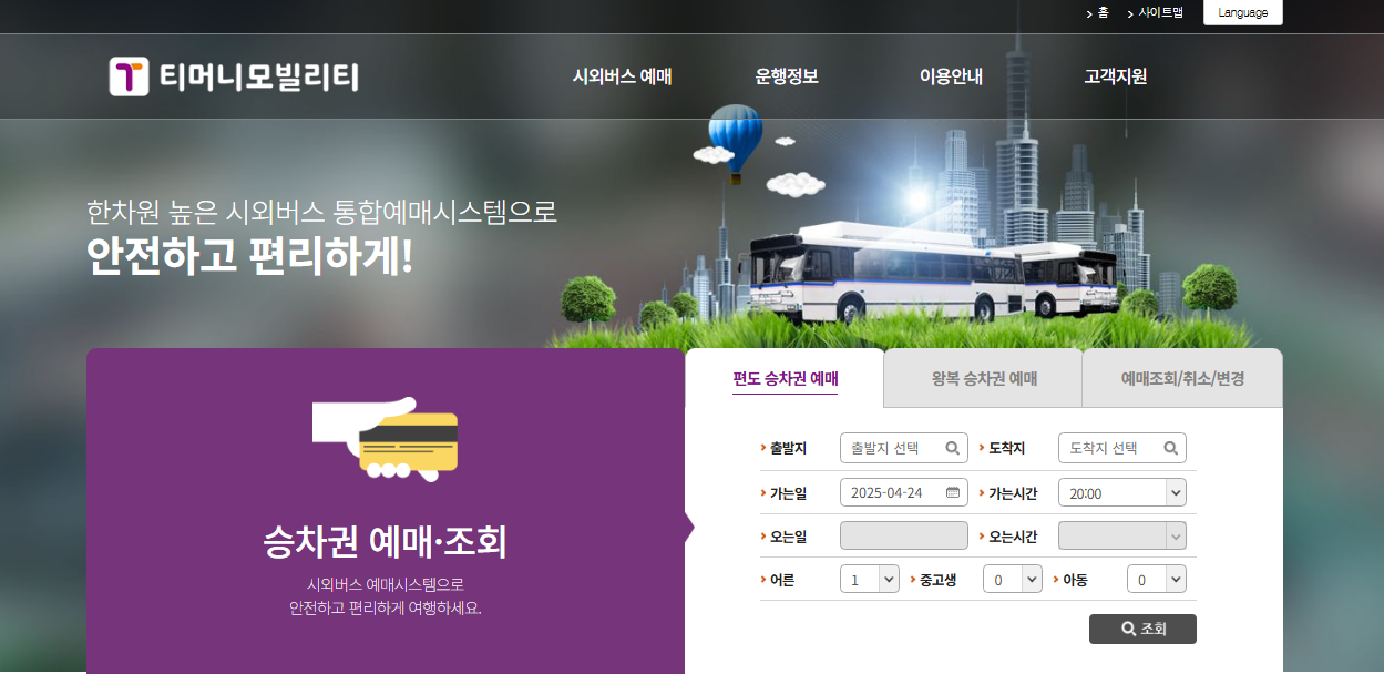 - 버스 예매 사이트나 앱에 접속합니다(버스타고, 티머니고 등)