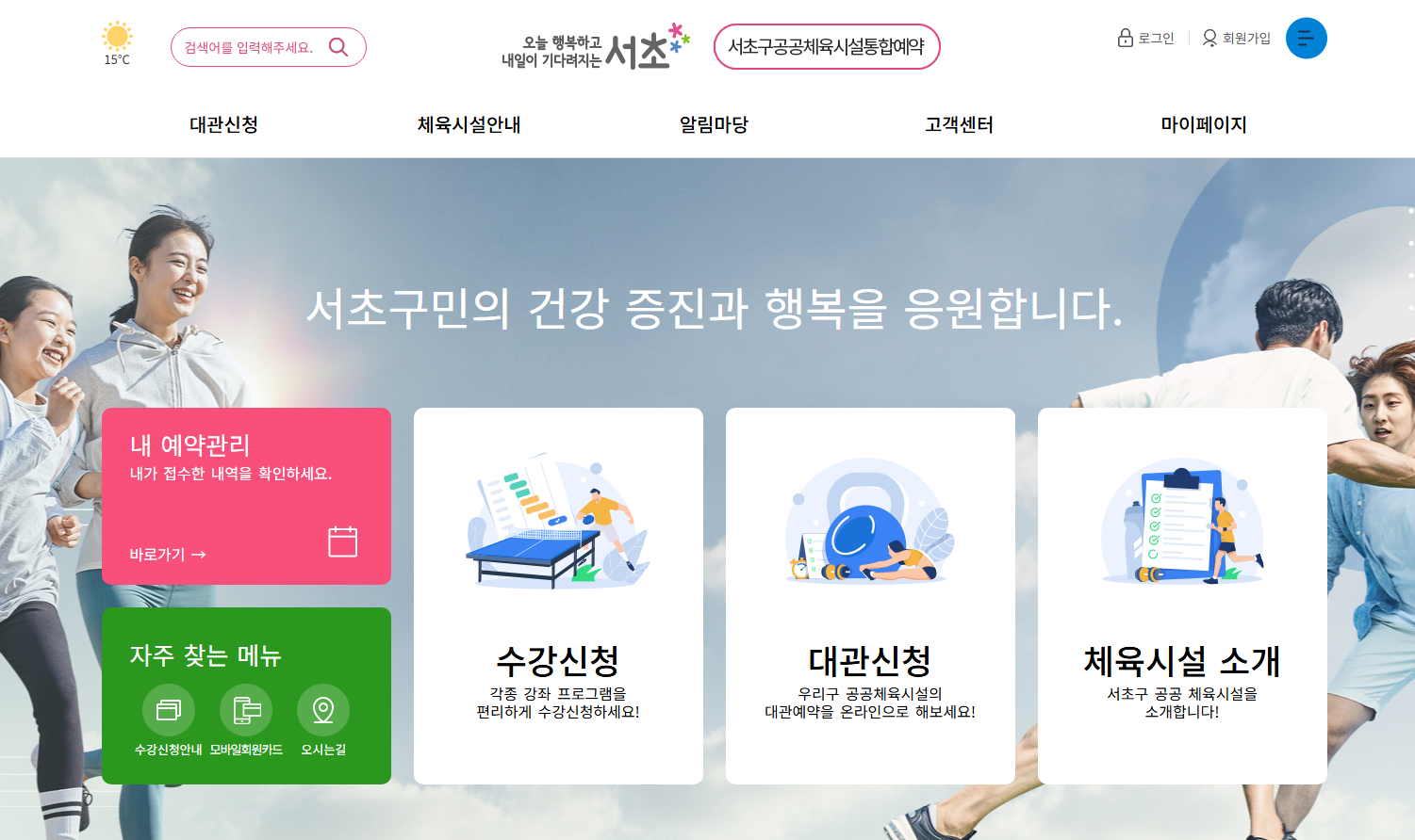 서초구 시설관리공단 홈페이지 체육시설 통합예약 시스템을 통해 편리하게 체육시설을 이용하고, 건강한 생활을 유지하시기 바랍니다.