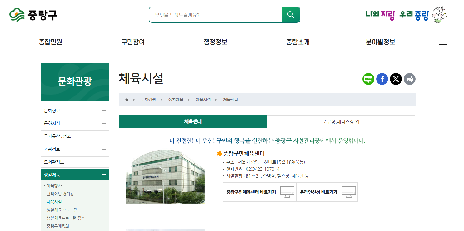 중랑구 시설관리공단 체육시설 현황