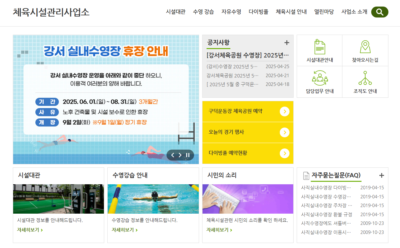 - 대부분의 시설은 2주 전부터 예약 가능하며, 수영강습은 매월 20~21일 선착순 접수.