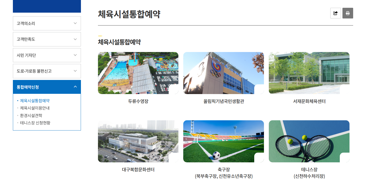 - 두류수영장, 올림픽기념국민생활관, 서재문화체육센터, 대구복합문화센터 등 주요 체육시설을 모두 통합 예약 시스템에서 확인 및 예약할 수 있습니다.