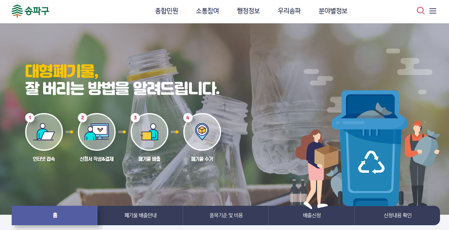 - 송파구청 홈페이지 접속: 송파구청 홈페이지에 접속하여 '자주찾는 서비스' 메뉴에서 '대형생활폐기물'을 선택하거나, 대형생활폐기물 인터넷 신청 사이트로 바로 접속합니다.