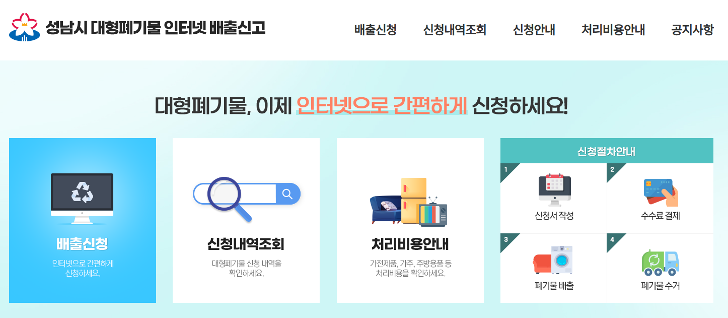 - 성남시청 홈페이지 접속: 성남시청 홈페이지에 접속하여 '자주찾는 서비스' 메뉴에서 '대형생활폐기물'을 선택하거나, 대형생활폐기물 인터넷 신청 사이트로 바로 접속합니다.