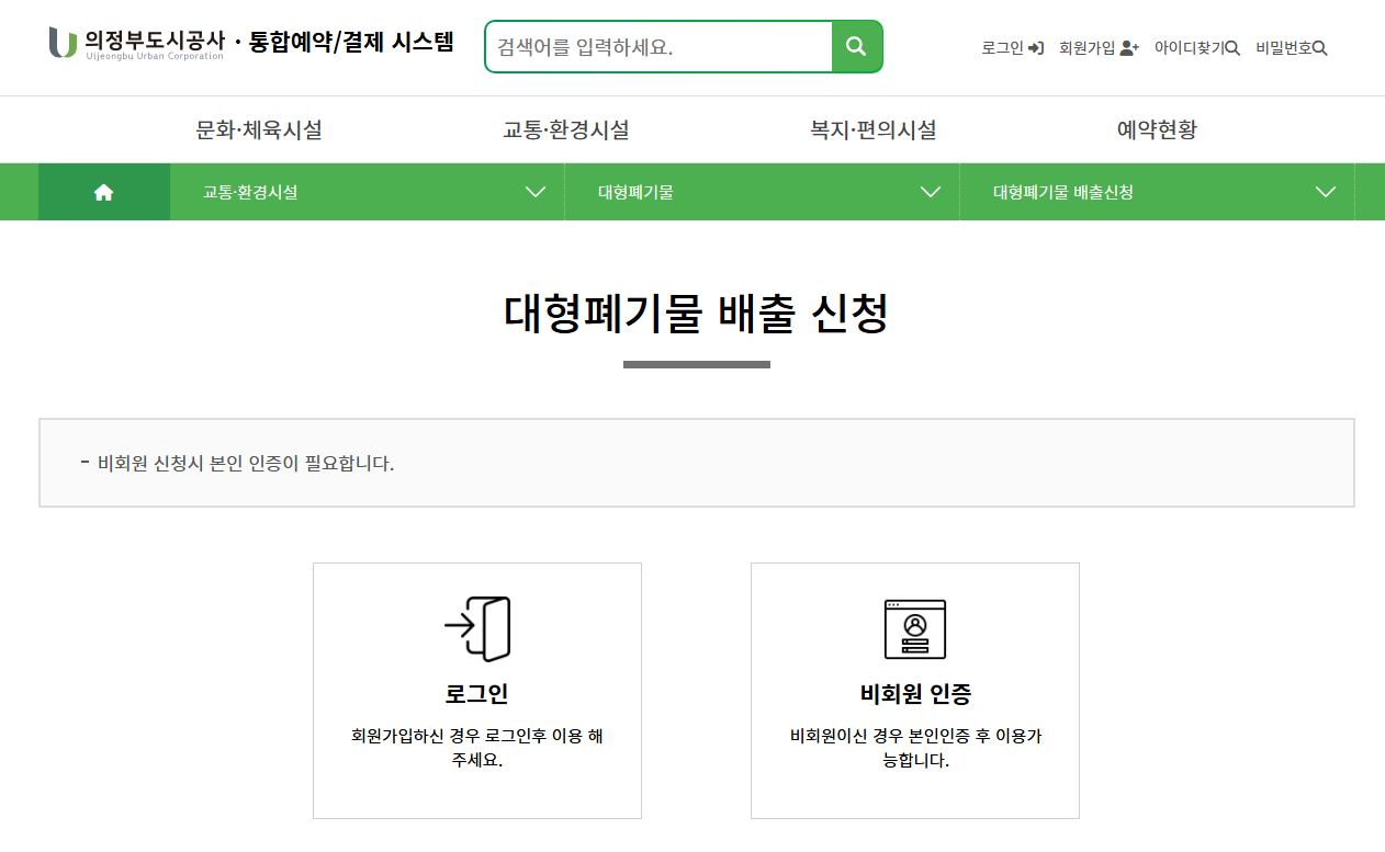 - 의정부시청 홈페이지 접속: 의정부시청 홈페이지에 접속하여 '자주찾는 서비스' 메뉴에서 '대형생활폐기물'을 선택하거나, 대형생활폐기물 인터넷 신청 사이트로 바로 접속합니다.