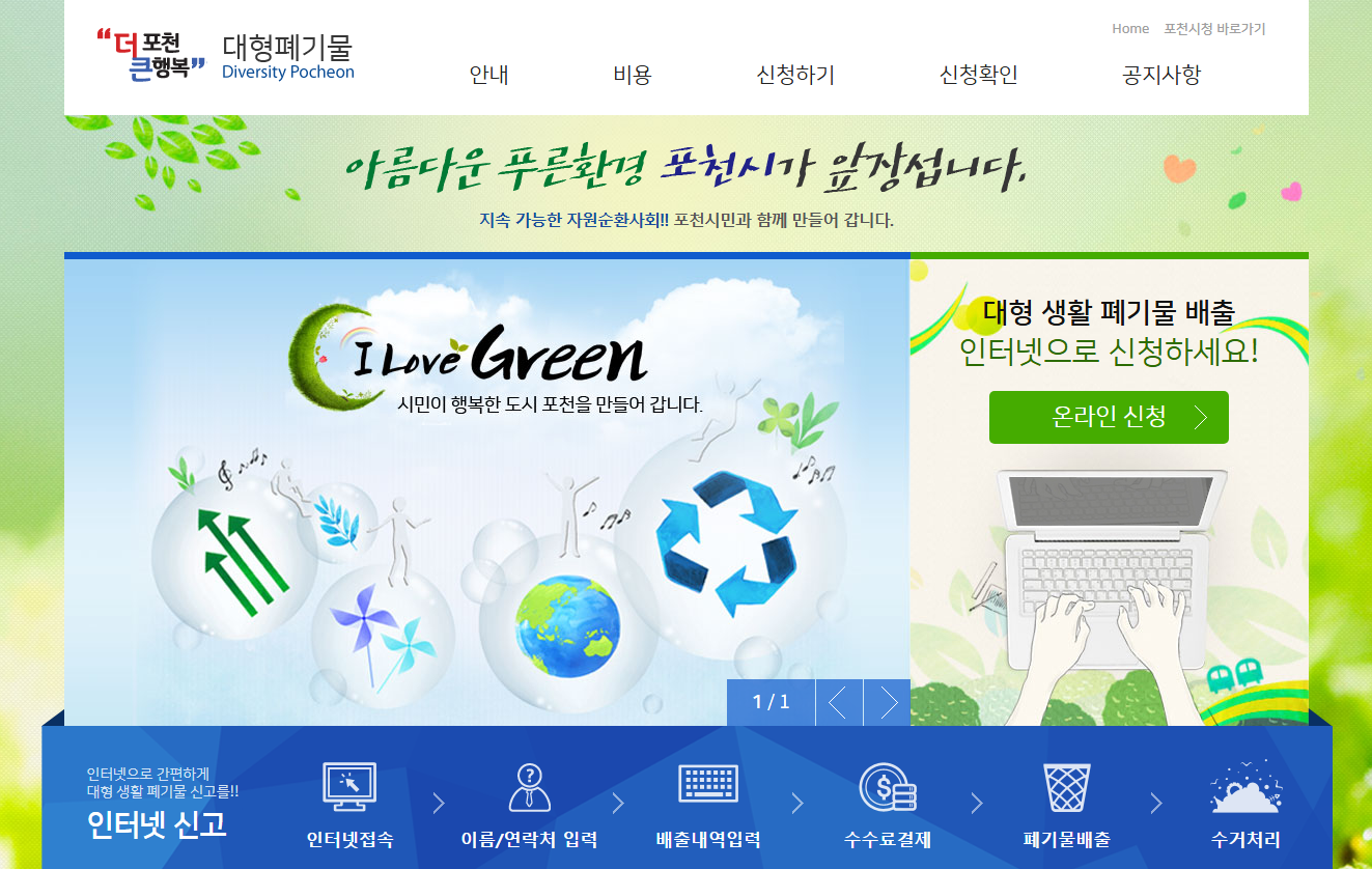 - 포천시청 홈페이지 접속: 포천시청 홈페이지에 접속하여 '자주찾는 서비스' 메뉴에서 '대형생활폐기물'을 선택하거나, 대형생활폐기물 인터넷 신청 사이트로 바로 접속합니다.