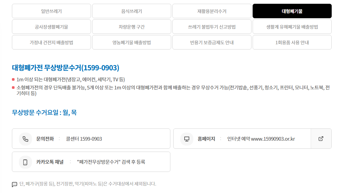 - 세트 수거 가능: 오디오 세트(전축), 데스크톱 PC 세트(본체+모니터)는 세트로 배출해야 합니다.