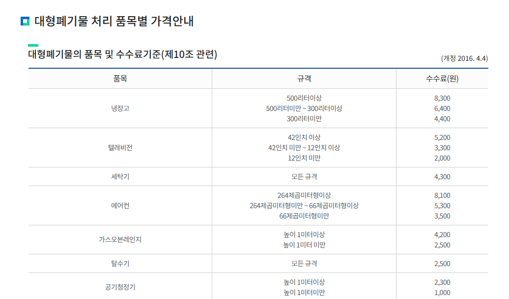 대형폐기물 배출 수수료 (가격)