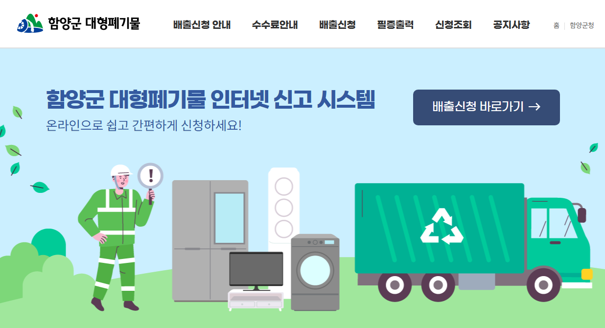- 함양군청 홈페이지 접속: 함양군청 홈페이지에 접속하여 '자주찾는 서비스' 메뉴에서 '대형생활폐기물'을 선택하거나, 대형생활폐기물 인터넷 신청 사이트로 바로 접속합니다.